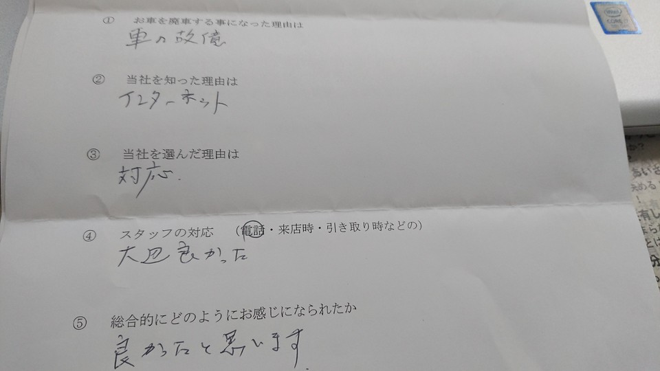廃車買取 宇都宮市  O様アンケート 31年4月20日買取